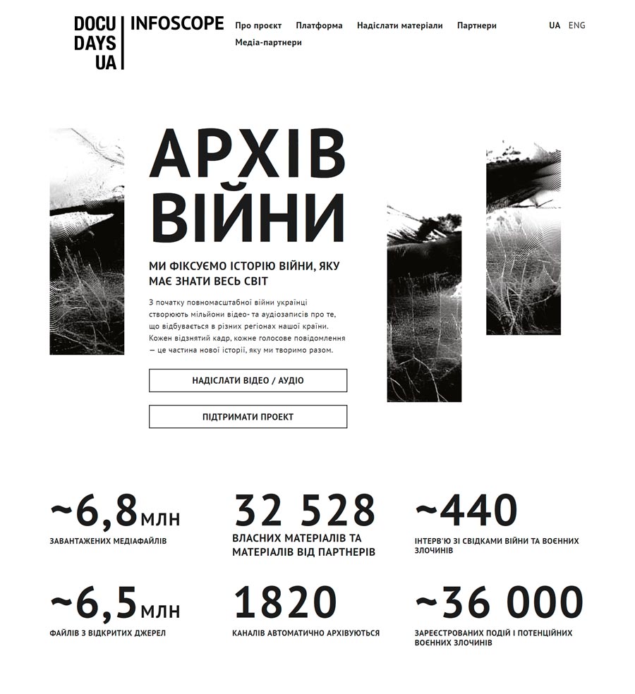 Через якийсь час, у березні, ми зідзвонилися з моїм університетським другом, який займається IT-розробками, і почали разом думати над тим, як організувати пошук, структурування, і захист цих даних. Він зі своєю компанією Infoscope взяв на себе програмну частину, а ми частково командою Docudays взяли на себе частину аналітичну, тобто ми шукаємо партнерів, ми запрошуємо ділитися своїми матеріалами. У нас є команда, яка дивиться відео і призначає їм ключові слова. Є команда документаторів, які їздять на звільнені території, говорять там з людьми та записують глибокі інтерв'ю про їхній досвід. Не тільки про воєнні злочини, які вони пережили, але якісь дуже прості побутові речі, які важливі будуть як документ історії.