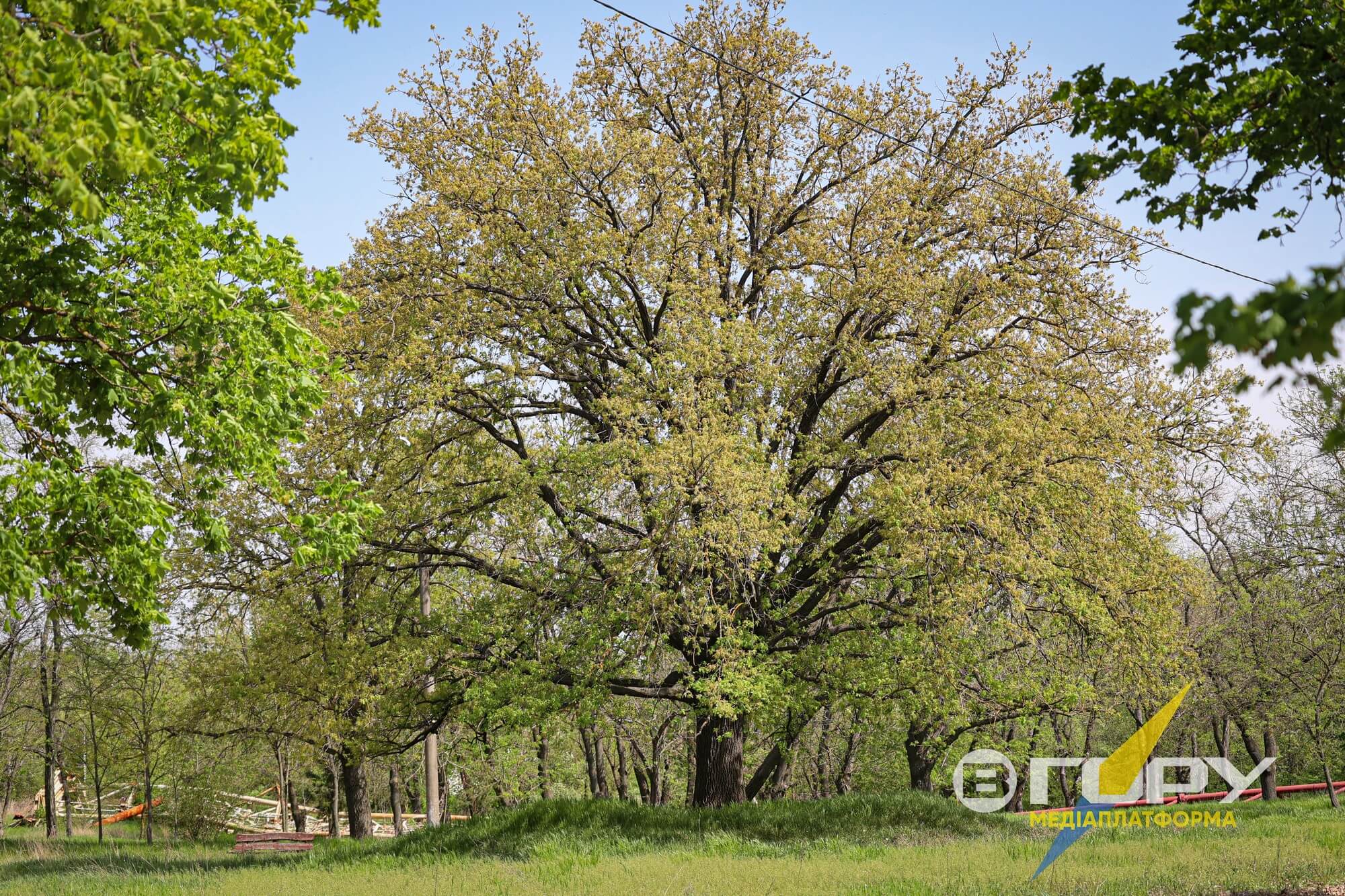 Старезний дуб розпускає листя, а за ним вже майже півтора року лежить підірвана при втечі росіянами телевежа.