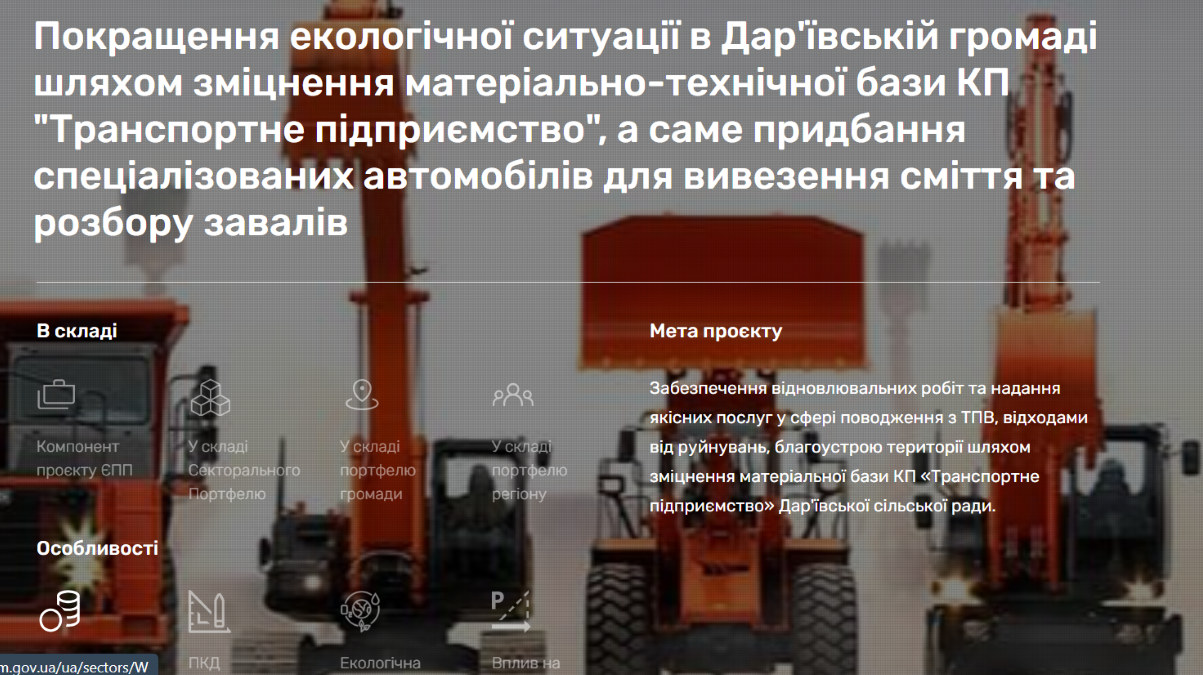 Дар’ївська громада Херсонської області, яка суттєво постраждала від бойових дій, реалізовує проєкт з покращення екологічної ситуації. Його мета — зміцнити матеріально-технічну базу КП "Транспортне підприємство" шляхом придбання спеціалізованої техніки.