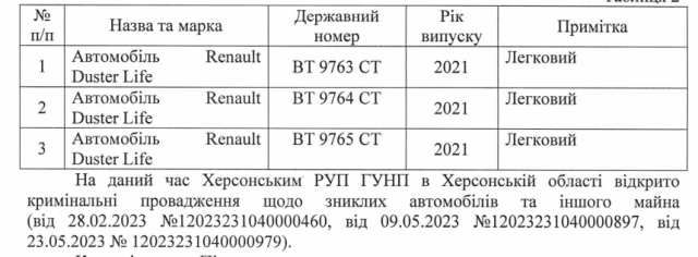 КП «Муніципальна варта» паралельно закуповує ще дві автівки «для себе». Кінцевий строк подання пропозицій на закупівлю двох «Рено Дастер» на загальну суму 1,6 млн грн — 26 жовтня. Попередня закупівля не відбулась — не було пропозицій.Відповідно до документів Херсонської МВА, на обліку «Муніципальної варти» до окупації Херсона було три авто «Рено Дастер» 2021 року випуску, але їх викрал росіяни. Відповідні кримінальні провадження зареєстрвоані в поліції.