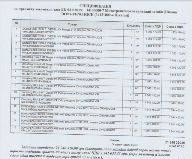 Згідно зі специфікацією, закуповують 15 авто — пікапів DONGFENG RICH різних моделей:Компанія-постачальниця — зі слідами агроскандалу