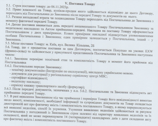 Загальна сума закупівлі становить 21 246 320,00 грн (21,2 млн грн). Угоду уклали 23 жовтня з київською кампанією, яка має донецькі корені, — ТОВ «Зернотрейд». Авто мають поставити до 6 листопада 2023 року за київською адресою: вулиця Велика Кільцева, 2Б. Принаймні так зазначили в угоді.