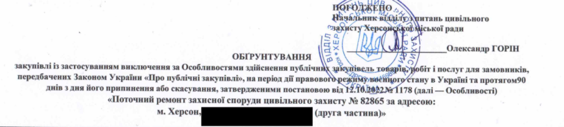 27 вересня 2023 року підряд на ремонт найпростішого укриття на суму в 1 648 583 гривні отримав фізособа-підприємець Ржевський Василь Миколайович із Києва. Згідно з договором, ФОП Ржевський має відремонтувати стіни та підлогу в укритті, а також встановити прихована під чорною плашкою.