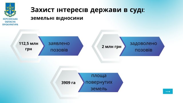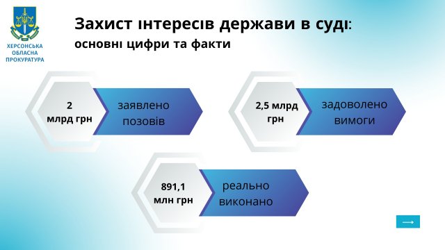 Підсумовуючи 2023 рік на захист інтересів держави прокурори органів прокуратури Херсонської області, пред’явили 84 позови на понад 2 млрд грн.Вартість активів, щодо яких суди задовольнили вимоги прокуратури, склала майже 2,5 млрд грн.Судові рішення, постановлені на користь держави за позовами прокурора, реально виконано на 891,1 млн грн.Площа повернутих земель, незаконне надання яких попереджене, складає 3909 га.
