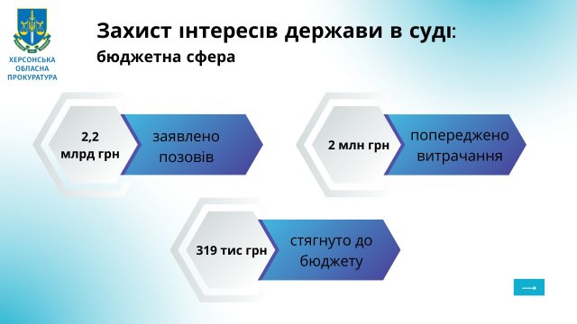 У бюджетній сфері пред’явлено 15 позовів на 2,2 млрд грн. Судом задоволено 12. Таким чином попереджене витрачання бюджетних коштів на суму майже 2 млн грн, стягнуто до бюджету 319 тис грн.