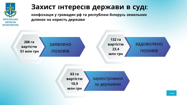 Також до суду направлено 40 позовів про конфіскацію у громадян російської федерації та республіки білорусь земельних ділянок площею 288 га та вартістю майже 51 млн грн. На теперішній час задоволено 18 позовів на 132 га площ та вартістю 23,4 млн грн. На цей час право власності на 12 земельних ділянок площею 63 га, вартістю 10,9 млн грн вже скасовано та зареєстровано за державою.