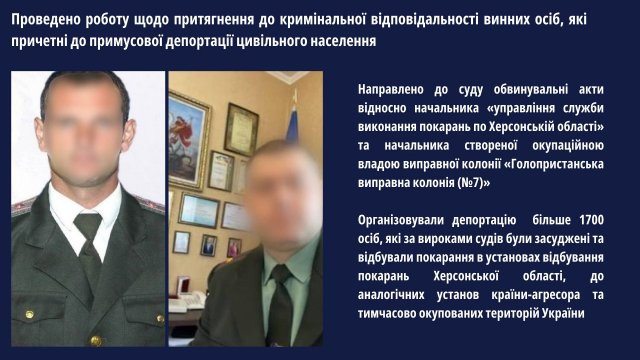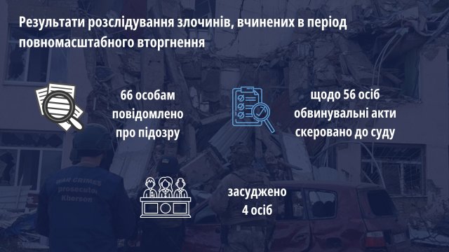 Всього за результатами розслідування злочинів проти миру, безпеки людства та міжнародного порядку у 2023 році повідомлено про підозру 66 особам, щодо 56 осіб обвинувальні акти скеровано до суду.