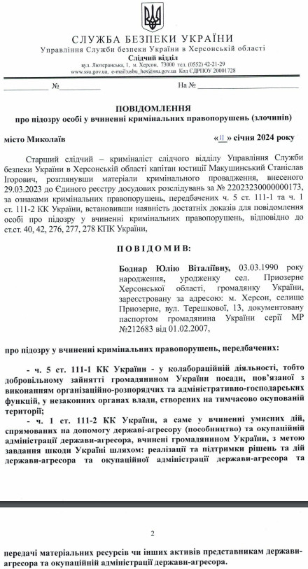 Юлії Боднар інкримінували колабораціонізм та пособництво державі-агресору. Вона пішла на співпрацю з росіянами не пізніше 23 серпня 2022 року.