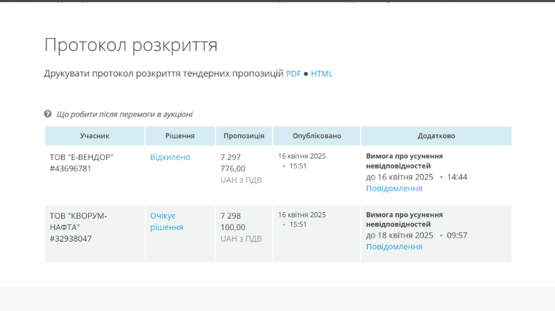 Аукціон відбувся 14 квітня, участь у ньому взяли три компанії. Переможцем став ТОВ "Кворум-нафта", яке запропонувало 7 мільйонів 298 тисяч 100 гривень — на 1,2 мільйона менше від очікуваної вартості. Наразі компанія чекає на рішення.
