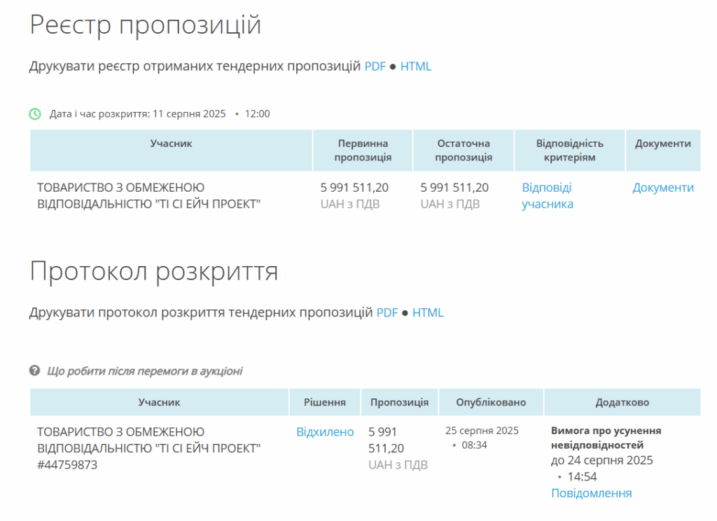 Тендер виграло ТОВ «Ті Сі Ейч Проект», зареєстроване у Києві у травні 2022 року. Основним є КВЕД 71.12 «Діяльність у сфері інжинірингу, геології та геодезії, надання послуг технічного консультування в цих сферах».