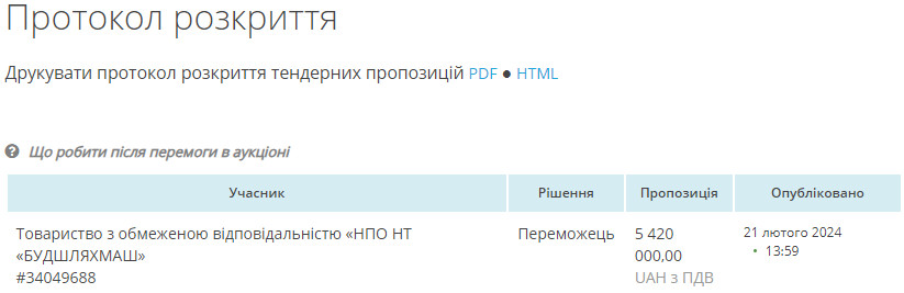 Що, по суті, автоматично зробило “Будшляхмаш” переможцем тендеру на 3 мільйони 605 тисяч 100 гривень.