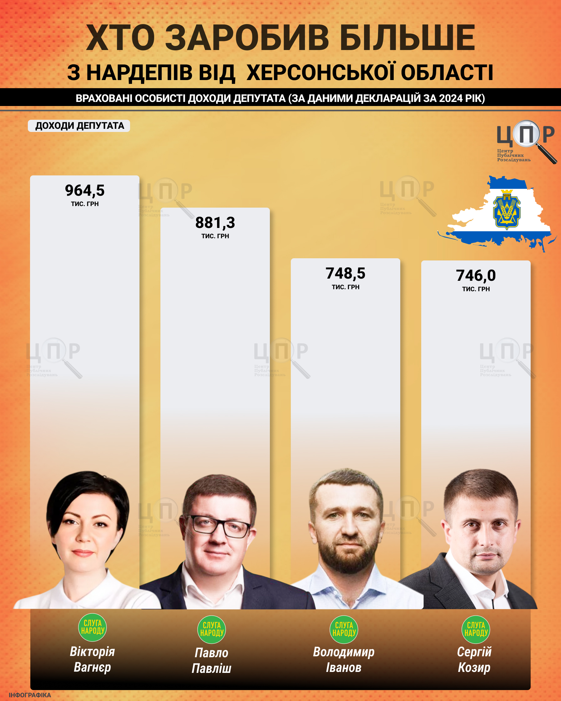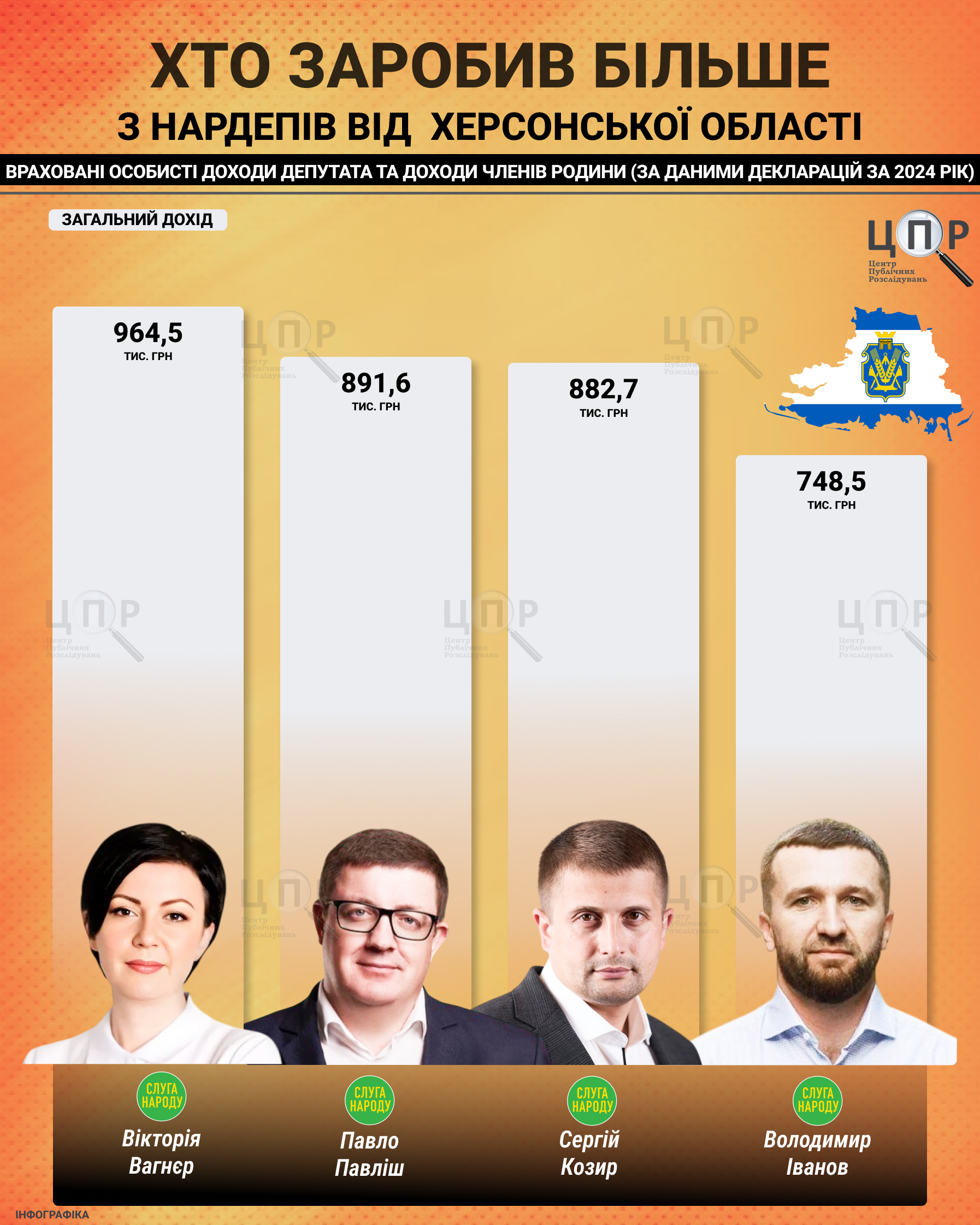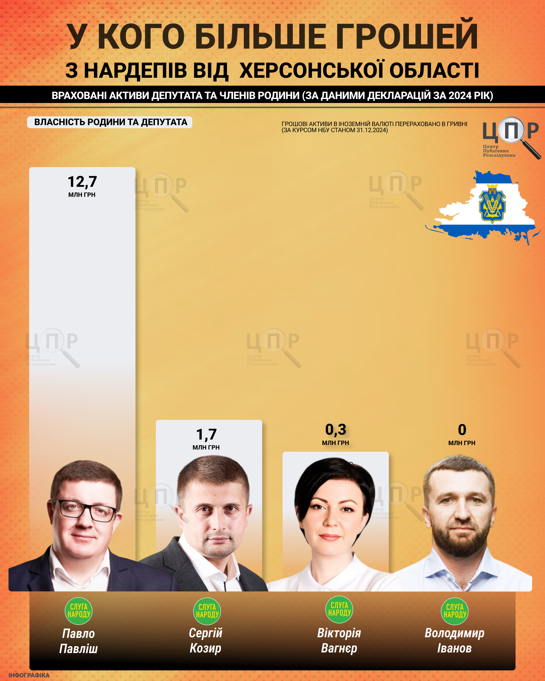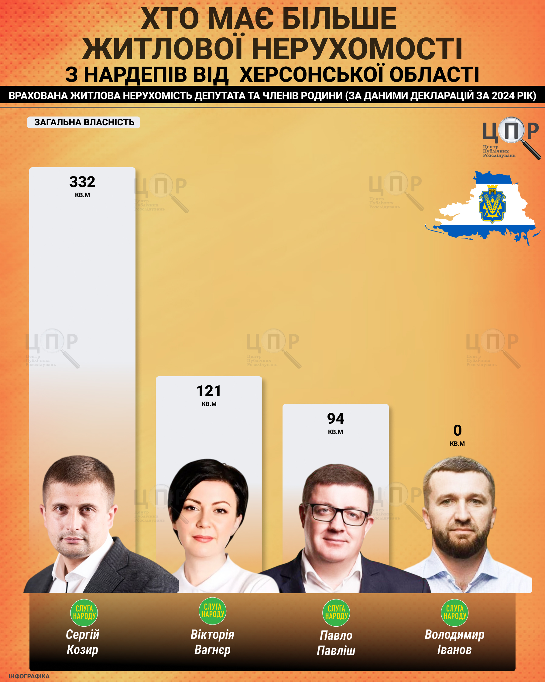 Центр публічних розслідувань дослідив фінансові звіти за 2024 рік депутатів-мажоритарників від Херсонської області. Більшість з них задекларували лише заробітну плату, відсутність цінного майна та сталий рівень доходів протягом трьох років. Винятком став лише один з них із мільйонними заощадженнями, у решти – обмежений набір активів і житла.Зазначимо, що у 2019 році народними депутатами від округів з Херсонщини за мажоритарною системою обрали Вікторію Вагнєр (Слуга народу), Володимира Іванова (Слуга народу), Олексія Ковальова (Слуга народу), Ігоря Колихаєва (Самовисування) та Павла Павліша (Слуга народу). Оскільки у 2020 році Ігор Колихаєв склав повноваження, ставши Херсонським міським головою, замість нього обрали Сергія Козиря (Слуга народу). Щодо Олексія Ковальова, то у 2022 році він пішов на співпрацю з росіянами, а наприкінці серпня 2022 року його вбили. Тож ЦПР проаналізував декларації чотирьох нардепів.
