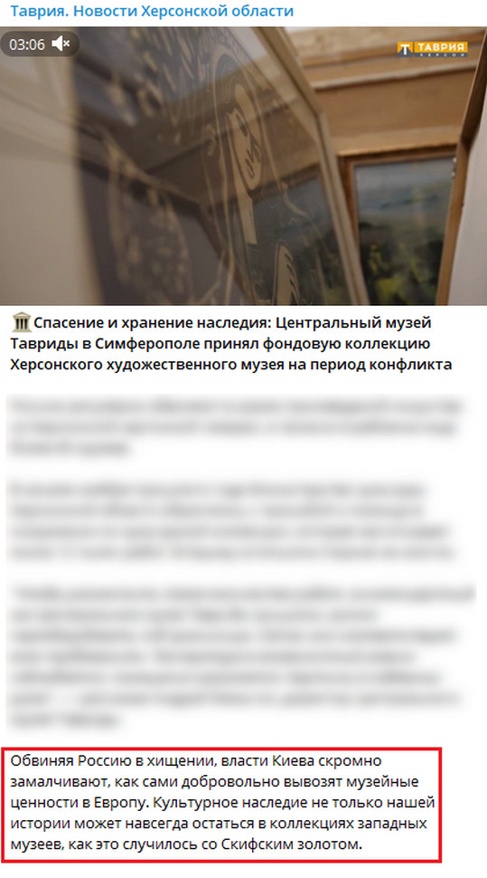 У Telegram-каналі ТРК “Таврія” написали, що центральна влада України нібито сама добровільно вивозить музейні цінності до Європи.