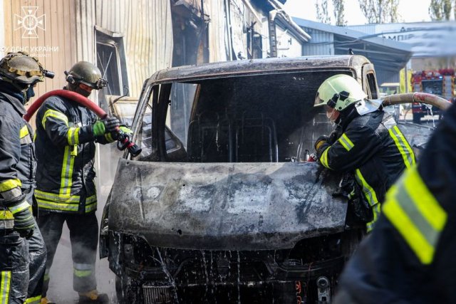 На світлинах — ліквідація пожежі на транспортному підприємстві та території автосервісу у Херсоні, що виникла внаслідок ранкової ворожої атаки.
