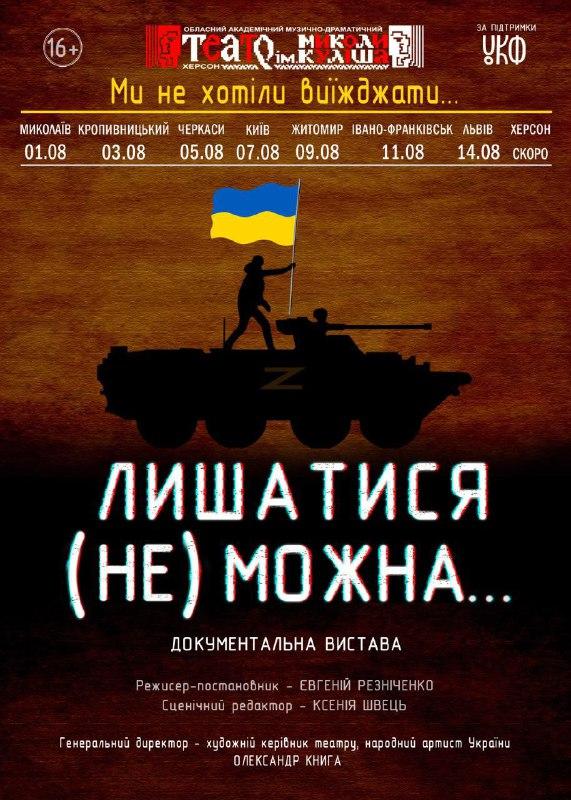 «Лишатися (не) можна…» – це документальна вистава про життя в окупації та виїзд на підконтрольну Україні територію. В основі сюжету – п`ять реальних історій співробітників Херсонського театру.