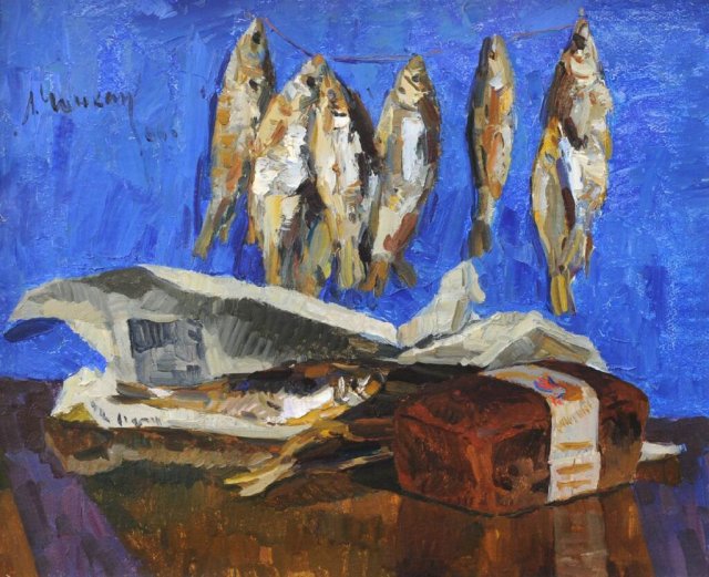 Заслужений діяч мистецтв Української РСР, професор Київського художнього інституту Леонід Чичкан був майстром тематичної картини, натюрморту, пейзажного та портретного живопису. Романтична краса Карпат, сила та врода мужніх гуцулів, картини з їхнього життя та історичного минулого – одна з головних тем у творчості художника. Однак серед улюблених мотивів митця є і натюрморти з рибою – майстер немов вихоплює моменти життя і у довершеній гармонії кольорів переносить їх на полотно.До речі, це вже друга робота Леоніда Чичкана, перебування якої в стінах Центрального музею Тавриди доведене. Перша, «Гладіолуси», була виявлена на найперших фото, відзнятих після пограбування музею на початку листопада 2022 року.