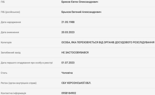 Бриков потрапив у реєстр в якості особи, яка переховується від органів влади. Початком його переховування вважається 20 березня.