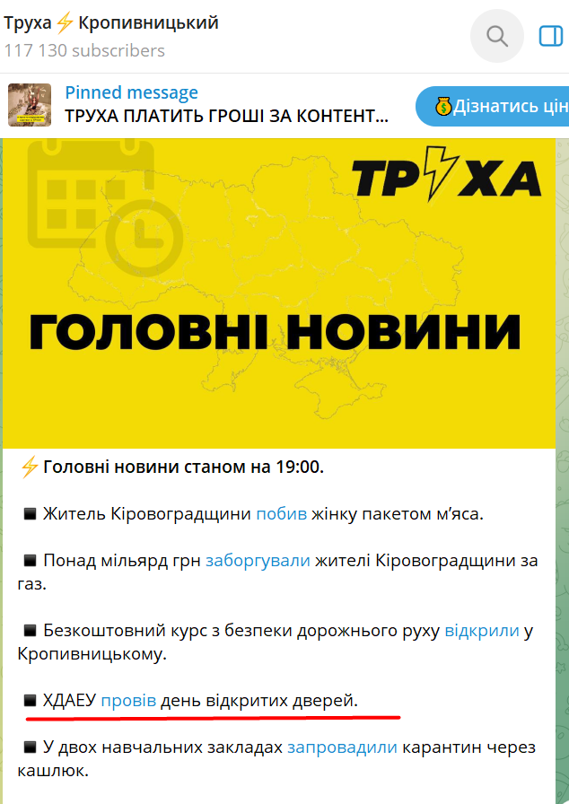 Херсонський державний аграрно-економічний університет заплатив за рекламу в телеграм-каналах «Труха Херсон» та «Труха Кропивницький». При цьому, редакція «Антикорупційного виміру» не знайшли повідомлень в жодному з каналів, які б рекламували університет. До того ж університет днями влаштував масові дводенні святкування дня відкритих дверей у Кропивницькому. Що з усім цим не так, дослідив «Антикорупційний вимір».