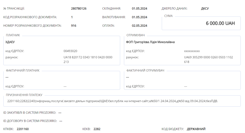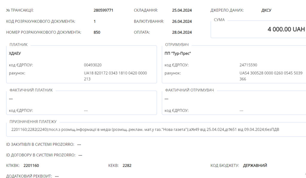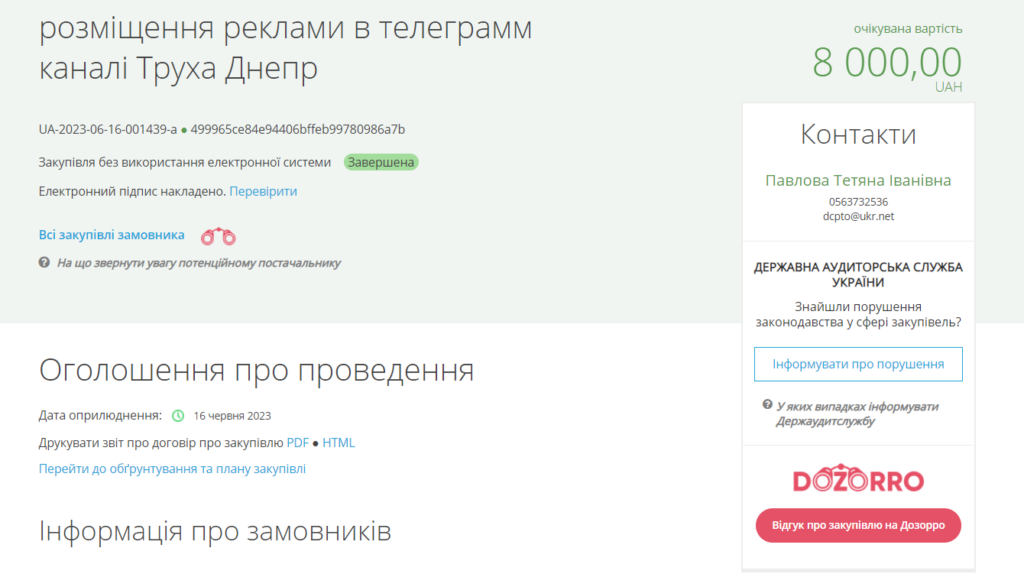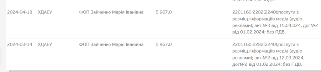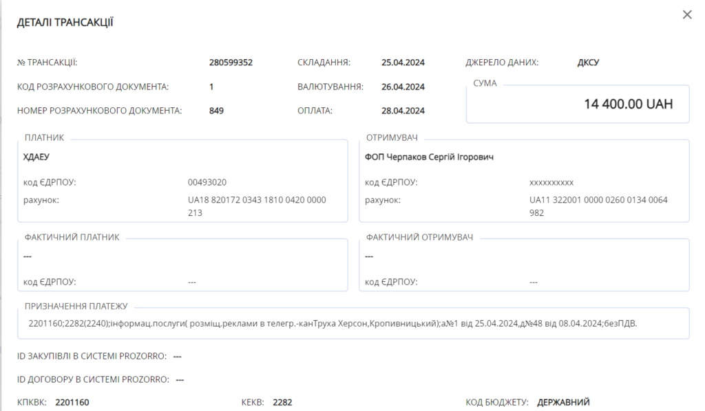 Оплата за рекламні послуги у телеграм-каналах «Труха Херсон» та «Труха Кропивницький» за державні кошти здійснена відповідно до даних порталу https://spending.gov.ua/ 26 квітня 2024 року на суму 14 400 грн. Договір уклали 8 квітня 2024 року, акт виконаних робіт отримали 25 квітня.