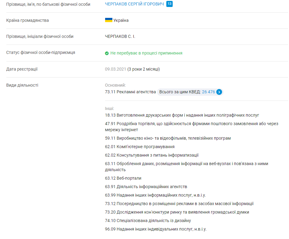 Оплата за рекламу в каналі, як видно зі скріншоту транзакції вище, здійснювалась на ФОП Черпаков Сергій Ігорович. Це підприємець з міста Дніпро, який працює зокрема у сфері реклами.