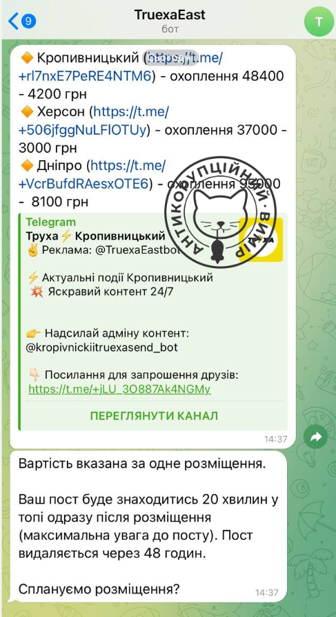 «Антикорупційний вимір» також спробував дізнатись, скільки саме коштує реклама в регіональних «Трухах» Херсона і Кропивницького. Нам відповіли доволі швидко: якщо реклама в загальній «Трусі» – це дійсно доволі дорого, то в регіонах – доступно. Пост в «Труха Херсон» коштує 3 000 гривень, у «Труха Кропивницький» — 4 200 гривень.