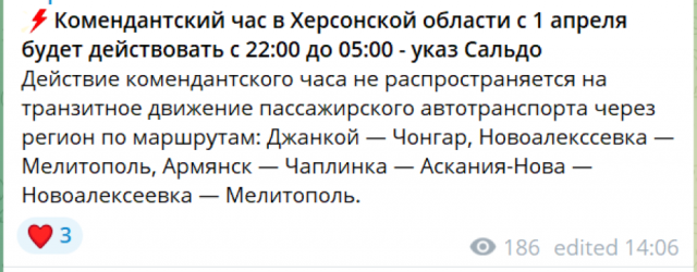 Так, з 1 квітня 2024 року комендантська година в окупованій Херсонщині триватиме з 22.00 до 05.00 ранку. Це не стосується транзитного руху пасажирського автотранспорту територіями Джанкой — Чонгар, Новоолексіївка — Мелітополь, Армянськ — Чаплинка — Асканія-Нова — Новоолексіївка — Мелітополь.