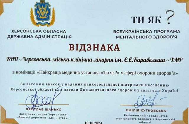 Херсонську лікарню ім.Є.Є.Карабелеша нагороджено відзнакою Всеукраїнської програми ментального здоров’я "Ти як?" у номінації "Найкраща медична установа "Ти як?" у сфері охорони здоров’я.Про це у Фейсбук повідомив керівник Херсонської МВА Роман Мрочко.