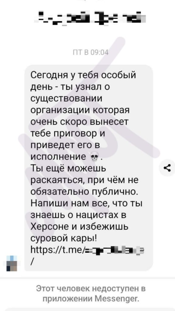 Аби невідомі залишили у спокої отримувача листа з погрозами, людина повинна публічно розкаятися та надіслати інформацію про нацистів у Херсоні до Telegram-каналу.