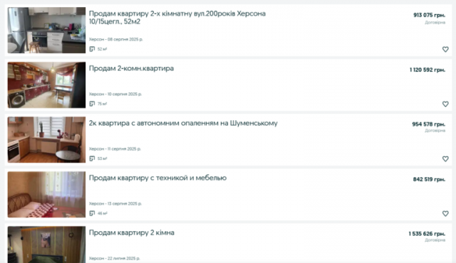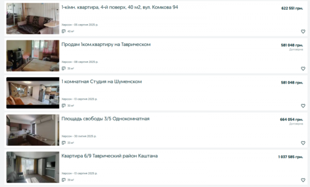 “Населення Херсона та передмістя розпродає житло та бізнес за низькою ціною. Однокімнатну квартиру можна купити за 290 тисяч гривень (559,7 тисяч рублів). Двушка коштує 435,7 тисяч гривень (840 тисяч рублів)”, – зазнчають росіяни.