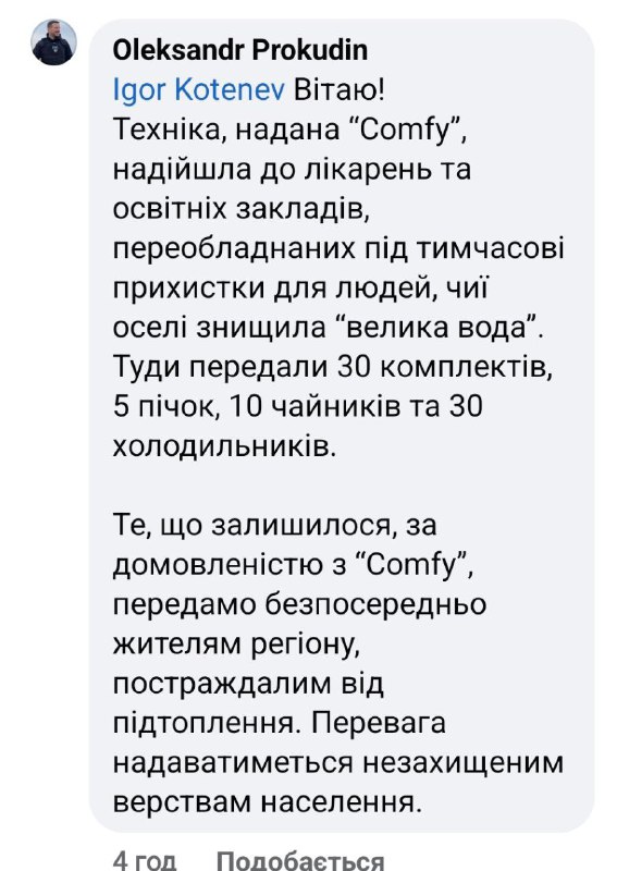 «Українці — нація дивовижних сміливців. Спільною підтримкою постраждалих від підриву греблі Каховської ГЕС ми вчергове доказали, наскільки сильні, коли разом. Скільки закритих зборів, переданих речей, корму, човнів, води, їжі. Скільки врятованих життів. Весь цей час ми були на звʼязку з Херсонською ОВА, щоб визначити, яку саме допомогу COMFY може надати найбільш ефективно. І от днями ми відвезли до Херсону три фури побутової техніки на 3 мільйони гривень: холодильники, пралки, генератори та дрібна техніка для тимчасового житла мешканців регіону, які опинилися в зоні затоплення.
