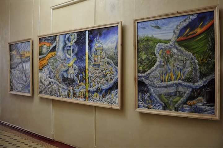 Картини Євгена Ситнікова «Лісова пісня» та «Анкіл – щит Марса» на виставці в Одеському музеї західного та східного мистецтва. Фото: Євген Ситніков / Facebook