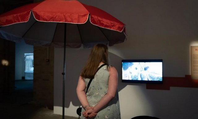 У напівтемряві правого крила "Мистецького Арсеналу" долинають впізнавані голоси телеведучих служби новин. Повідомлення з маленького старого автомобільного телевізора про захоплені сепаратистами будівлі адміністрацій Донеччини й Луганщини, незаконний референдум, після якого оголошують створення фейкових "ДНР" та "ЛНР" – з порогу виставкового простору провалюють у часі, назад в 2014 рік.