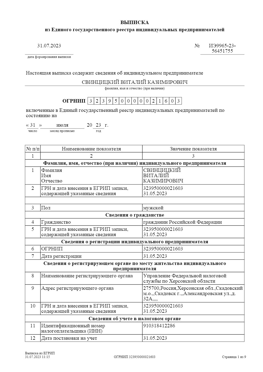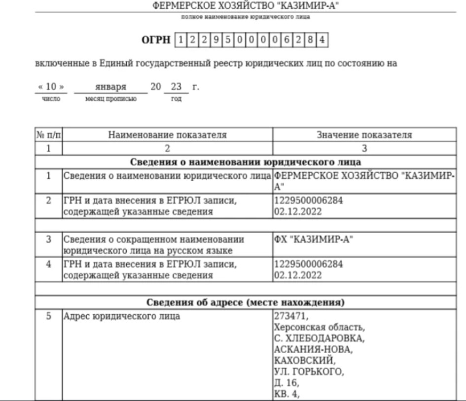 За даними з російського держреєстру юридичних осіб, Свінціцький Віталій Каземирович, 1954 року народження, отримав російський паспорт і 31 травня 2023 року зареєструвався індивідуальним підприємцем у російській юрисдикції, повідомляє Центр журналістських розслідувань. Основний вид діяльності його фермерського господарства «Казимир-А» – вирощування зернових, зернобобових культур і насіння олійних культур.Витяг із російського держреєстру індивідуальних підприємців