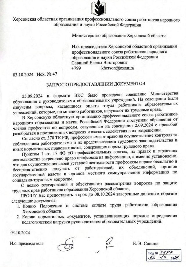 «За липень аванс я отримала, - написала в одному з окупаційних чатів генічанка Альона С„ яка працювала на росіян. - Хоча розрахувалась з роботи ще 16 серпня. А розрахункових до цих пір немає. Де можна дізнатись правду???» «Вчителі Херсонської області отримали чи то аванс, чи зарплату за вересень, - цитує працівників окупаційної освіти окупаційний телеграм-канал «Капитан Очевидность в Херсоне». - Невідомо. Так як суми зрізані на 50 %. Жодних підтверджень, пояснень немає. Директорів шкіл Міністерство освіти, Централізована бухгалтерія постійно просять зробити і переробити тарифікації вчителів, посилаючи на положення про оплату праці 2023 р.»Особливо активні вчителі-колаборанти почали звертатись у «профспілку», яку невідомо для чого окупанти створили на Херсонщині (немов у когось там є якість права?), «профспілка» звернулась у «міністерство освіти» з запитом щодо надання документів про оплату праці педагогів і порядок визначення педагогічного навантаження.