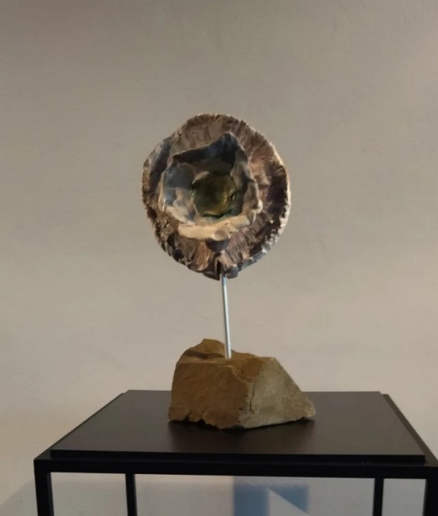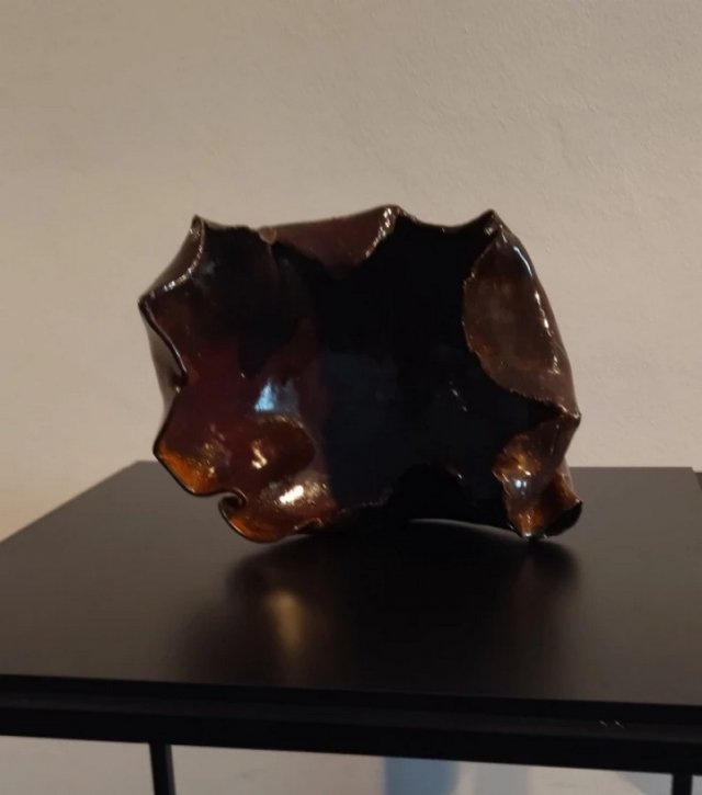 Декоративна миска темно-бронзового кольору не має назви, бо є зразком ужиткового мистецтва. Ії можна використовувати і за призначенням, і як декор. Це образ, який асоціюється з органічною глибиною, космічним простором, чорною дірою. А головне те, що кожен глядач може інтерпретувати твір по-своєму.