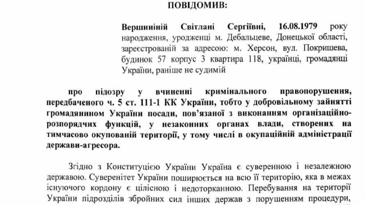 Слідчі органів повідомили про підозру Вершиніній Світлані Сергіївні, 16 серпня 1979 року народження, громадянці України. Жінка підозрюється у вчиненні кримінального правопорушення, передбаченого ч. 5 ст. 111-1 Кримінального кодексу України — добровільне зайняття посади в незаконних органах влади на тимчасово окупованій території.