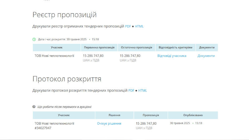 Скриншот: ProzorroІ це була вже друга спроба знайти підрядника: у березні 2024 року ТОВ "Нові теплотехнології" отримали підряд зобов’язанням завершити роботи до кінця року, які так і не виконали. Через це департамент оголосив новий тендер.