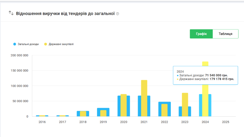 Товариство почало заробляти на державних закупівлях з 2016 року і наразі має понад 526 мільйонів гривень, причому найбільше компанія заробила у 2024 році, коли отримали підрядів на суму понад 179 мільйонів гривень.