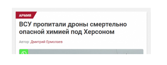 “Дрони, які на нас запускають ЗСУ, почали просочувати хімією. Вона здатна призвести до смерті. Як було у мене у підрозділі: запустили на наші позиції коптер, після його посадки ми не звернули уваги на дивні крапки на ньому. Солдата, який його підняв, за півтори години почало рвати, піднялася температура, було сильне запаморочення. Після кількох днів у лікарні він відновився, діагностували отруєння”, – передають слова російського військового прокремлівські журналісти.