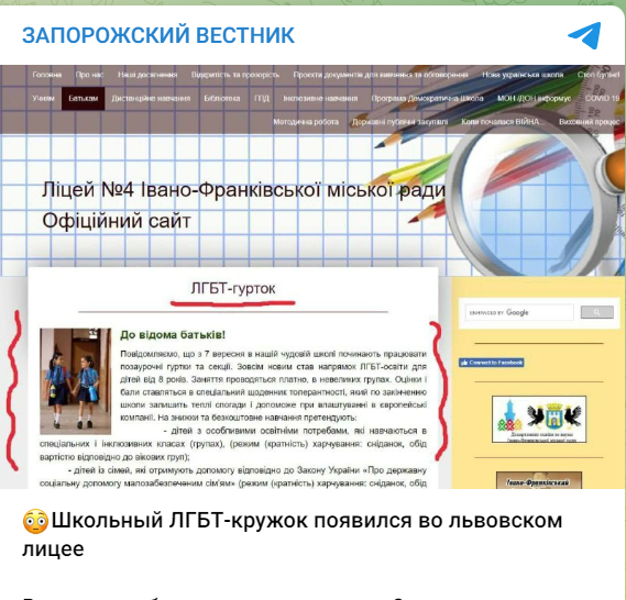 Наприклад, проросійські Телеграм-канали радо розповсюдили новину про те, що в одній із львівських шкіл відкрили платний “ЛГБТ-гурток”, навчання в якому дасть перевагу при вступі на роботу до іноземних компаній. Ось тільки вказаного навчального закладу у місті Лева взагалі не існує, а новину про нібито гурток у львівській школі недолугі пропагандисти проілюстрували підробленим скріном із веб-сайту ліцею №4 Івано-Франківської міської ради. Проте “ЛГБТ-гуртка” немає і в цьому навчальному закладі, але навіть не намагайтесь це довести типовому споживачу російського контенту.