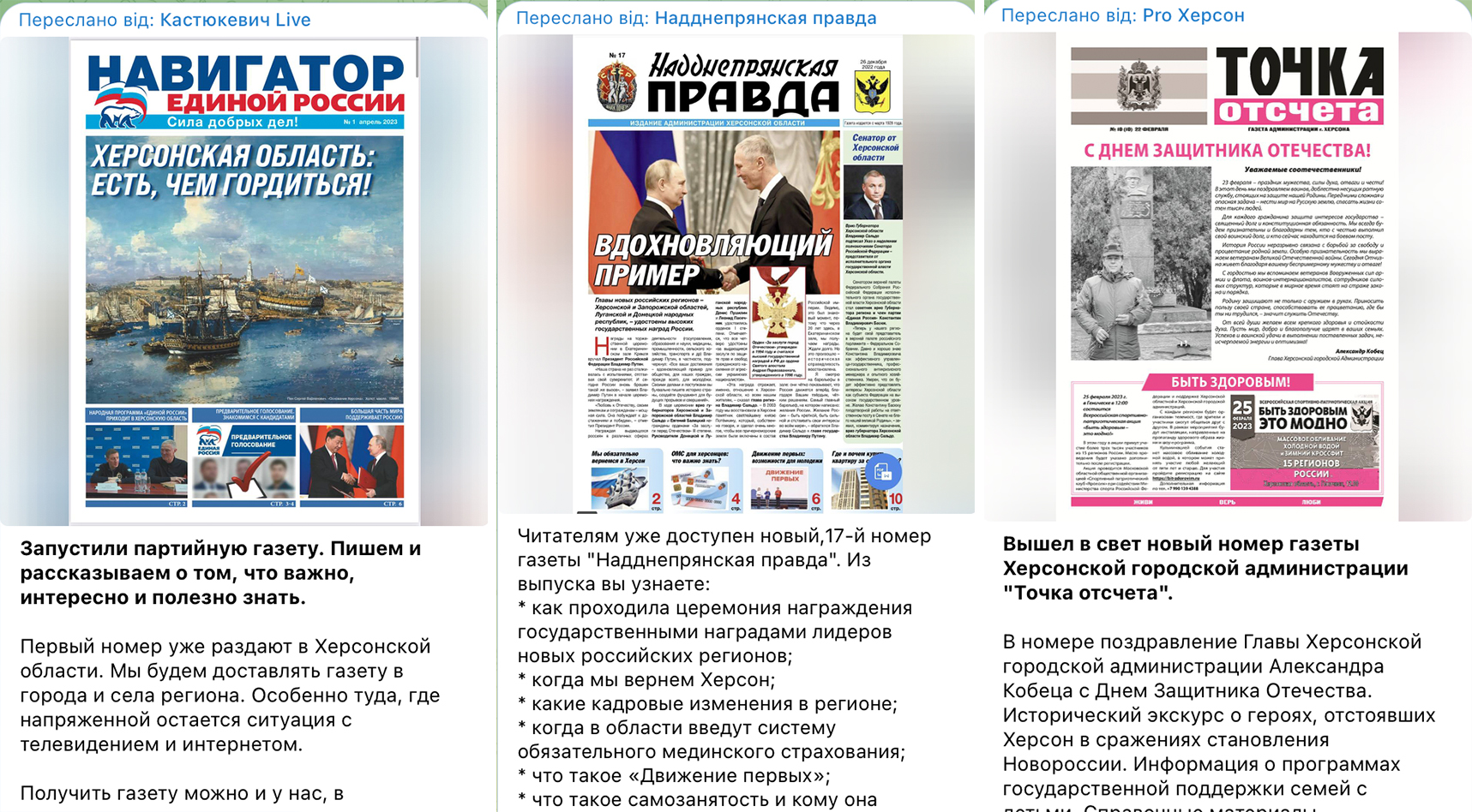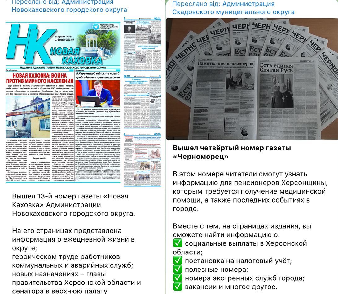 Для впливу на старше покоління українців на окупованих територіях росіяни фінансують друк газет. Наприклад, це видання, які розповсюджуються в окупованих Скадовську та Новій Каховці. Це також газета окупаційної адміністрації Херсона, яка тепер дислокується в окупованому Генічеську.