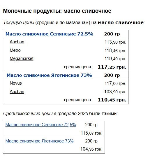 Зокрема, вершкове масло "Селянське" з жирністю 72,5% (200 г) тепер у середньому коштує 117,25 грн, що на 2,18 грн більше, ніж у лютому (115,07 грн). Найвигіднішу пропозицію можна знайти в мережі Auchan – 113,90 грн, тоді як у Megamarket ціна сягає 119,40 грн.
