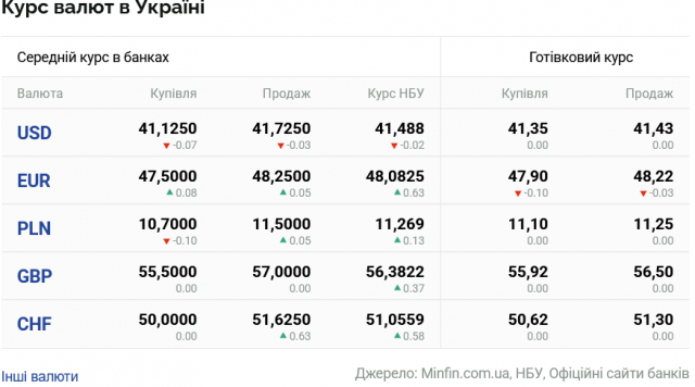 - monobank: 41,17 - 41,65 грн/$ та 47,60 - 48,34 грн/EUR.