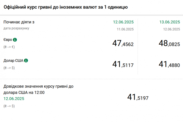 - 1 долар США — 41,48 грн (41,51 грн станом на 12 червня);