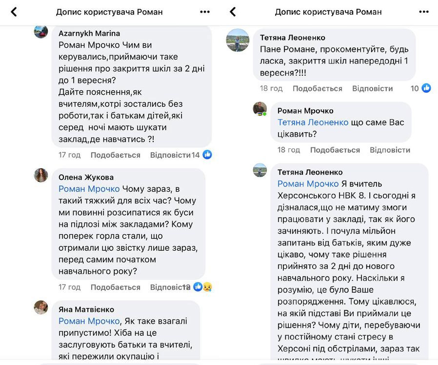 «Я вчитель Херсонського НВК 8. І сьогодні я дізналася, що не матиму змоги працювати у закладі, так як його зачиняють. І почула мільйон запитань від батьків, яким дуже цікаво, чому таке рішення прийнято за 2 дні до нового навчального року. Наскільки я розумію, це було ваше розпорядження. Тому цікавлюся, на якій підставі ви приймали це рішення? Чому діти, перебуваючи у постійному стані стресу в Херсоні під обстрілами, зараз так швидко мають шукати інші заклади? І ще порадьте, куди діватися колективу, який залишився без роботи? Вам показати батьківські чати і сльози дітей початкової школи, які звикли до своїх перших вчителів і тепер у розпачі? Обґрунтуйте своє рішення. Невже заклади освіти – це найбільший тягар для місцевого бюджету? Можливо, ви почнете економити на чомусь іншому?» – написала пані Людмила під одним з постів у Facebook Романа Мрочка.