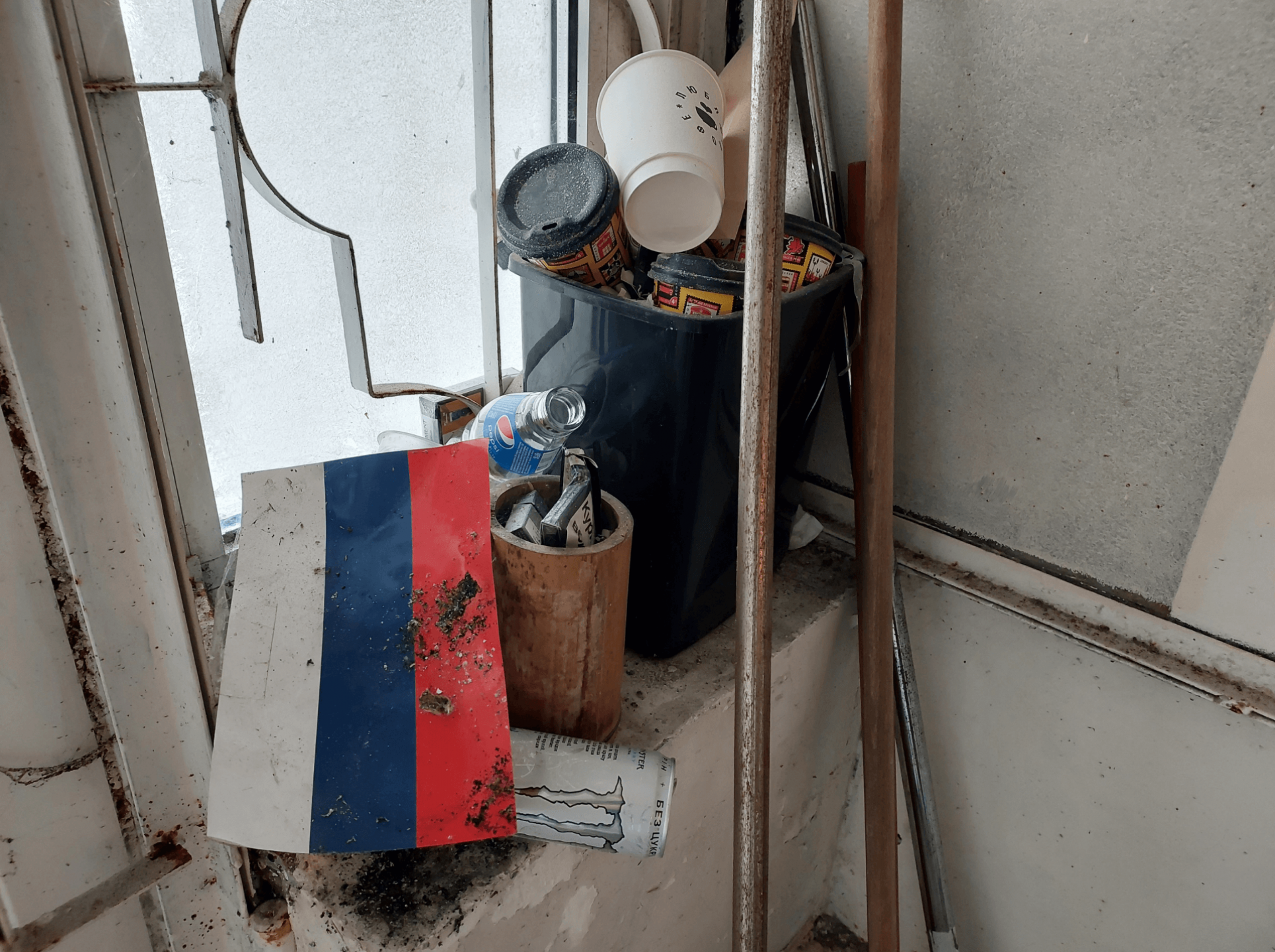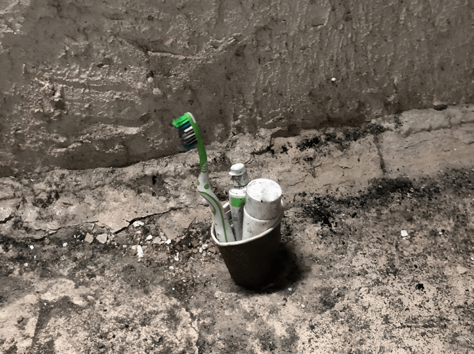 Ось у кутку горнятко з зубною щіткою. Для чого чистити зуби не дуже чистою водою, що крапає з іржавої системи опалення? Напевно, для когось це була можливість в екстремальних умовах зберегти людську гідність.