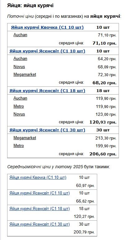 Найнижчі ціни пропонують Auchan і Metro. В Auchan яйця "Квочка" (С1, 10 штук) коштують 71,10 грн. Тут також найдешевші яйця "Ясенсвіт" (С1, 10 шт.) – всього 64,20 грн. Упаковку "Ясенсвіт" (С1, 18 шт.) можна придбати за 119,90 грн в обох магазинах – Auchan і Metro.