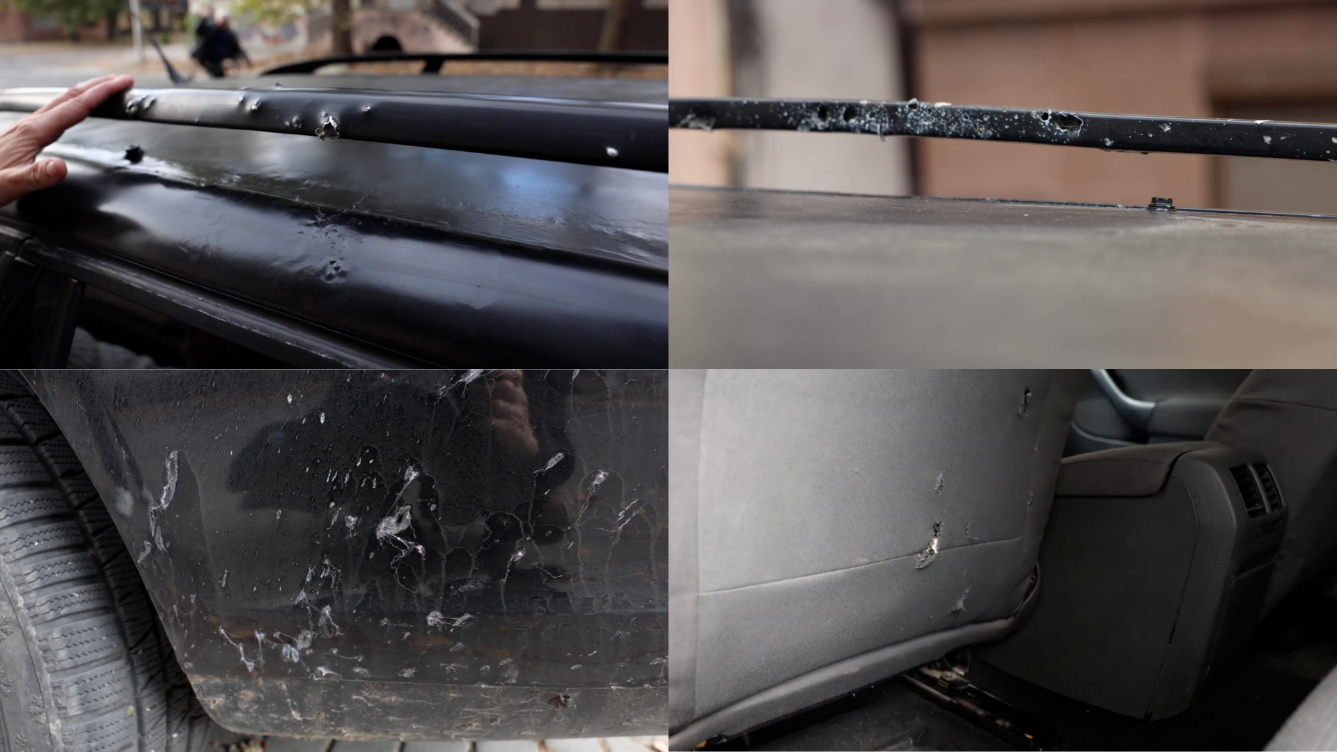 Окрім коліс і бака, осколки вибили заднє скло. Ще й “прилетіло” зверху над пасажирським сидінням. А тому добре, що пасажирів не було.