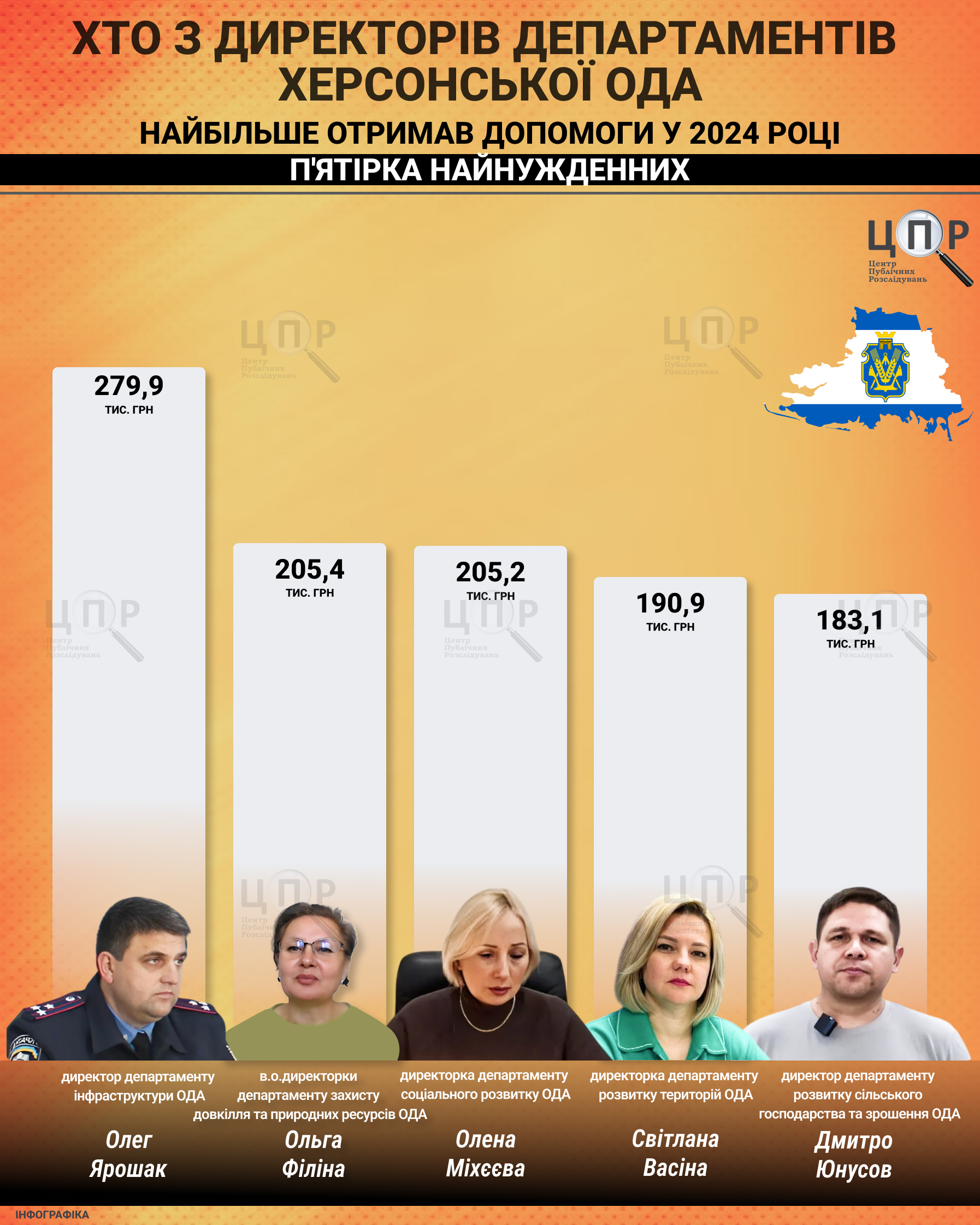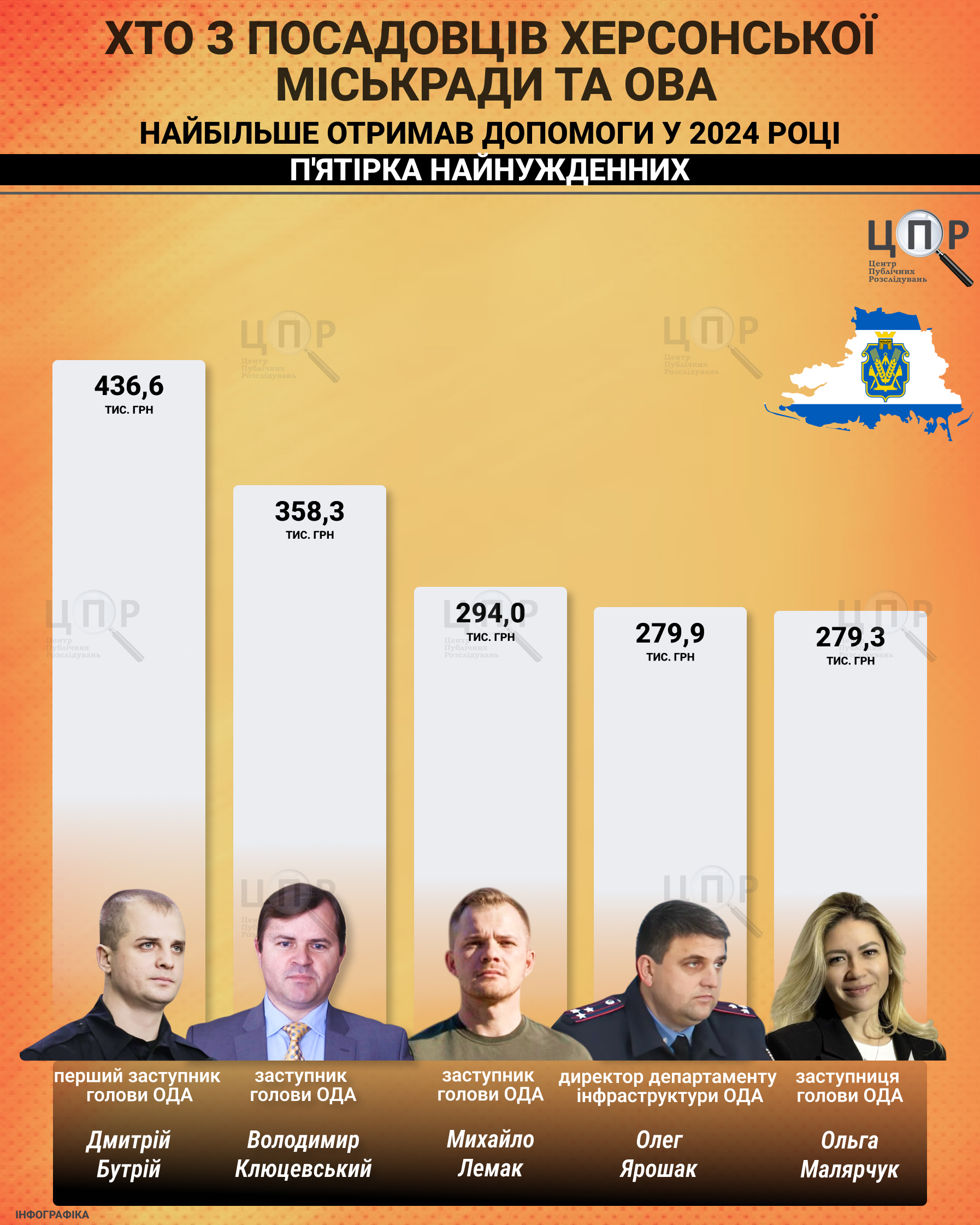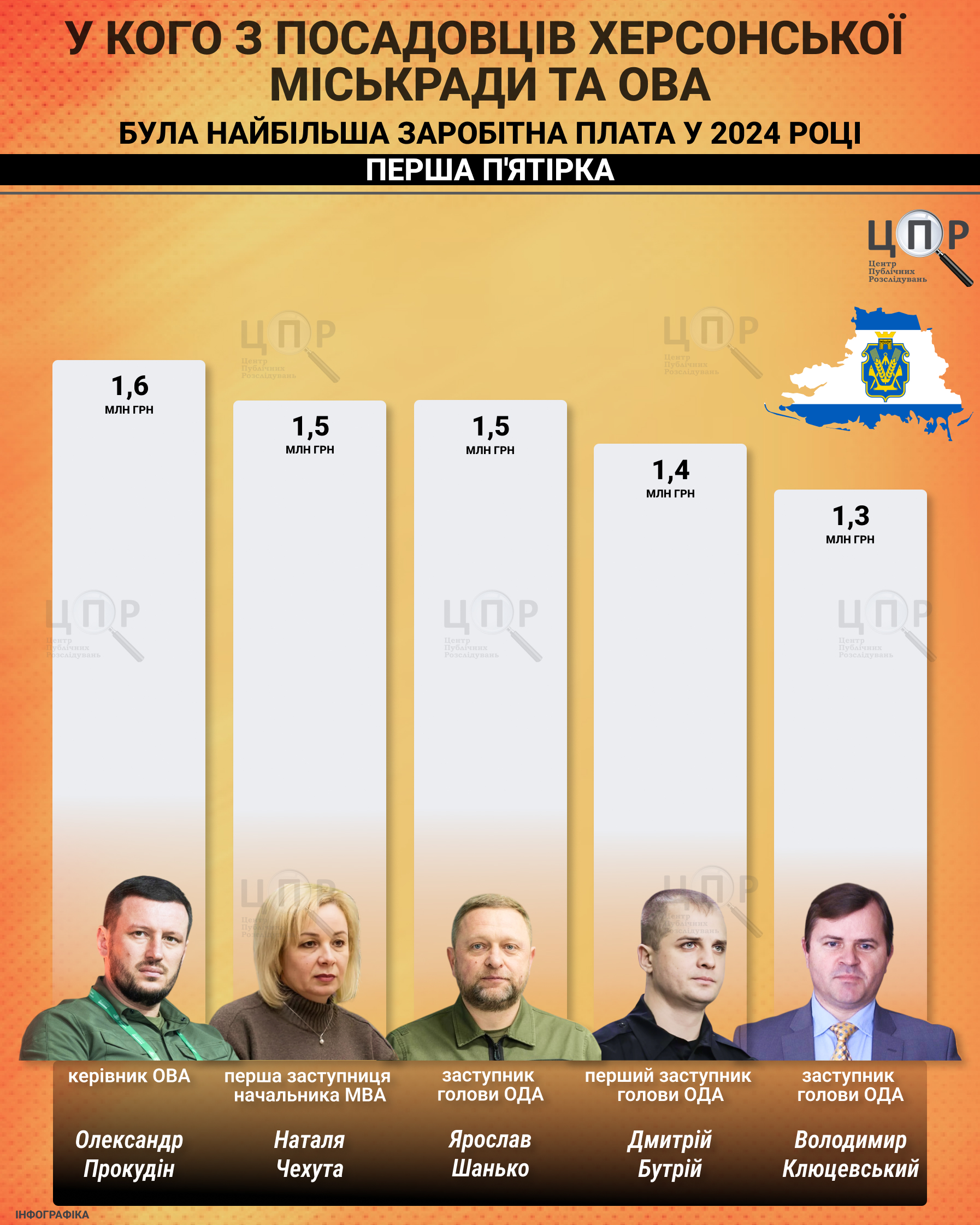 Єдиний, хто не отримав додаткових виплат – керівник Херсонської ОВА Олександр Прокудін. Впродовж 2024 року – ані відпускних, ані матеріальної допомоги, проте його заробіток склав 1,6 мільйона гривень — найбільший серед посадовців.