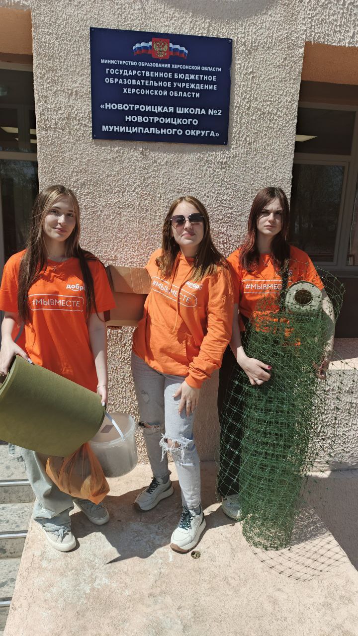 “Учні Новотроїцької школи № 2 виготовили маскувальні сітки для бійців спеціальної військової операції. Добровольці штабу “Ми разом” провели для школярів майстер-клас із плетіння маскувальних сіток”.